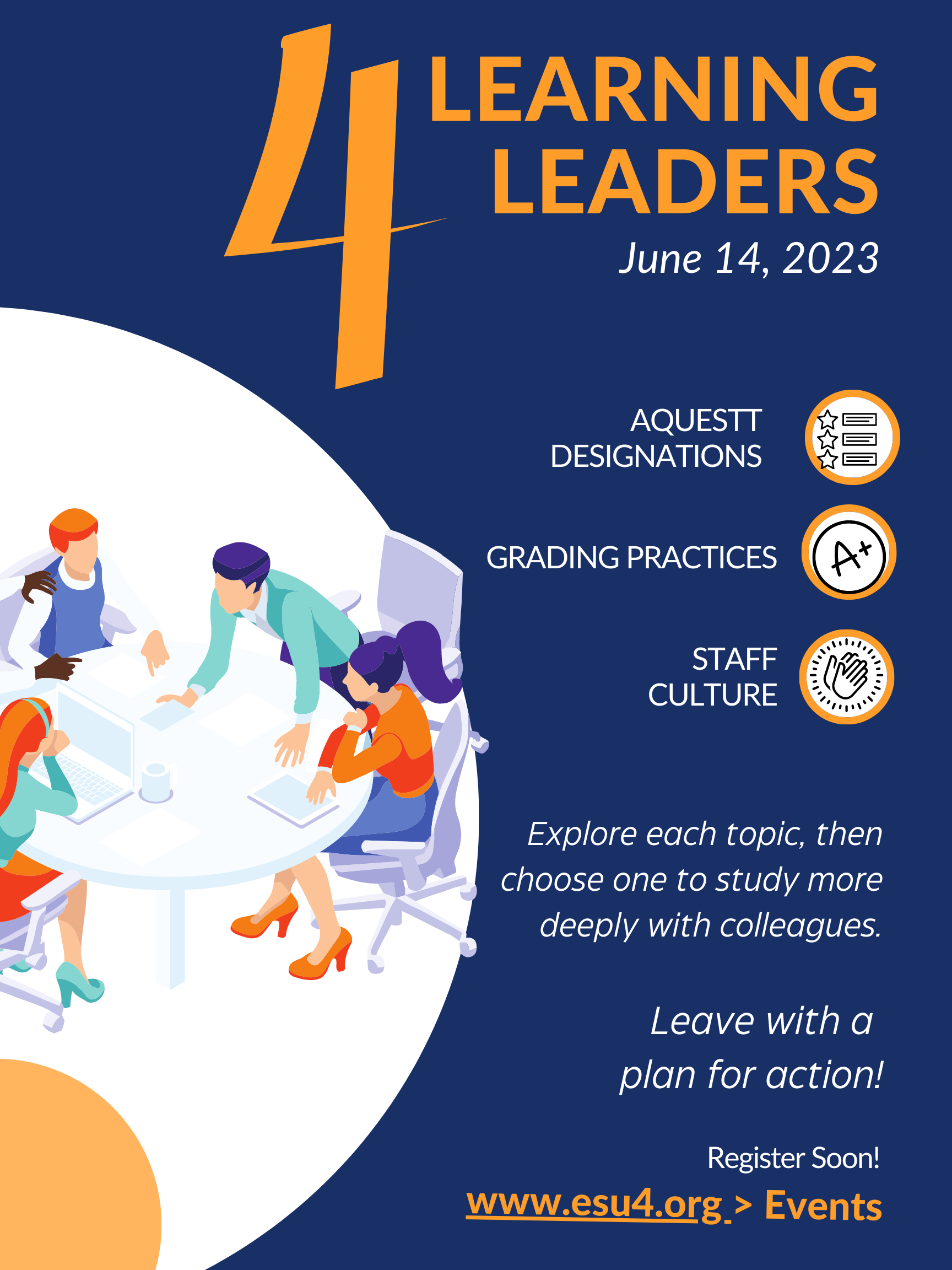 | Description | | Join ESU 4 principals and leaders for topical learning and networking. This particular session will focus on three topics chosen by ESU 4 leaders! We’ll explore staff recognition/appreciation, AQuESTT classification/designation, and grading practices. The format will include shared information, collaborative study, and discussion. Sessions are open to all relevant school leaders (i.e., principals, superintendents, SPED directors, DACs.) Bring a teacher leader with you!