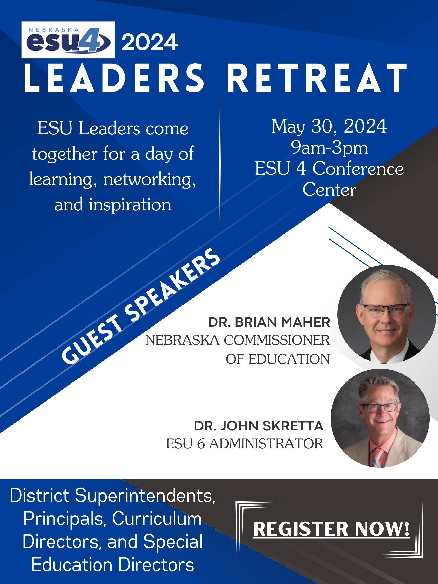 | Description | | ESU 4 will be welcoming Nebraska Education Commissioner Dr. Brian Maher and ESU 6 Administrator Dr. John Skretta to engage with ESU 4 Superintendents, Principals, Curriculum & SPED Directors. More details coming soon!