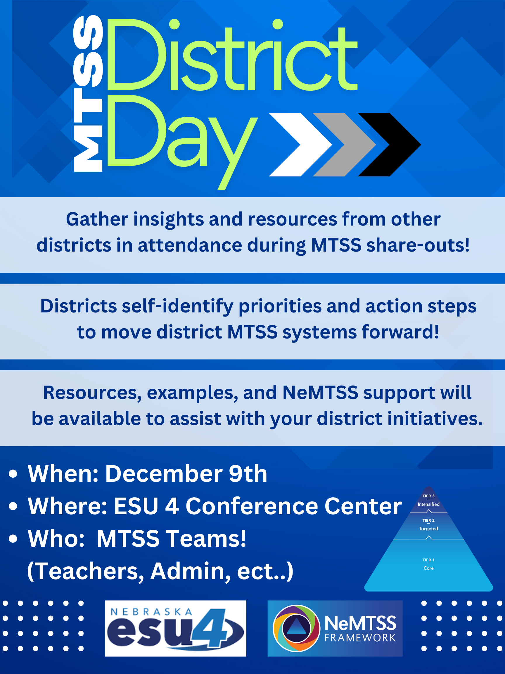 | Description | | The NeMTSS team, along with ESU 4, will be offering a day for MTSS teams to work towards district-identified objectives, network with other school districts, and gain resources needed to further MTSS systems.