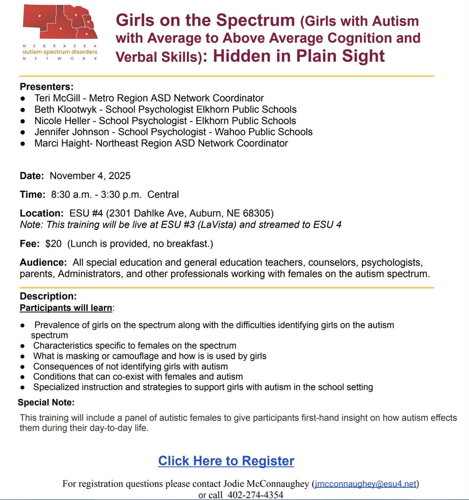 | | 0 | Girls on The Spectrum (Girls with Austism with Average above Cognition and Verbal Skills): Hidden in Plain Sight | 11/4/2025 8:30:00 AM | | Educational Service Unit 4 | McConnaughey | System.Collections.Generic.List`1[odie.workshops.Facilitator] | | 0.00 |  | odie.workshops.Section |